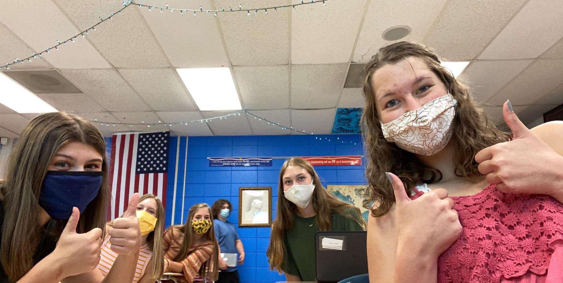 At first, I didn't think much of it. It wasn't too bad when I found out about it, but the virus was getting progressively worse. As we were leaving school for spring break, I expected to go back to school the following week. That is not what ended up happening. Cases were increasing, but I still wasn't very worried. I mainly focused on it being a risk mostly for older people, but younger people starting catching the virus. I never left my house except to go grocery shopping with my mom. My family didn't really take any precautions, we expected it to not affect us. My mom continued going to work when businesses starting shutting down for the time being. With being around the same people everyday, we didn't worry much. At the time, I was playing competitive volleyball. I still had about five or six tournaments left, but they all got cancelled. We were not able to make up the rest of the season, which was definitely upsetting. There ended up being a big party just outside of the town I lived in, and there were about 300+ people from my school and surrounding schools. It was not too long after restaurants and stores started opening back up along with sports activities. A lot of people ended up receiving the virus, leading to some restaurants to close one again. A lot of people from my school's cheer team had to be quarantined. Sports were once again shut down, waiting until the week before school started to start back up again. I was still involved in a summer league volleyball team, but we took precautions. We sanitized, didn't come in contact with the other team, and the spectators wore masks. It wasn't too much different, but school volleyball is going to be much different. There are a certain amount of people each player can invite, we have to wear masks on the bench (and while playing depending on where we are), and of course, spectators have to social distance and wear masks as well. During school when social distancing of 6 feet is not available, we are required to wear masks. There was an option of doing online school, or going in person. This is a picture of my friends and me during history class.