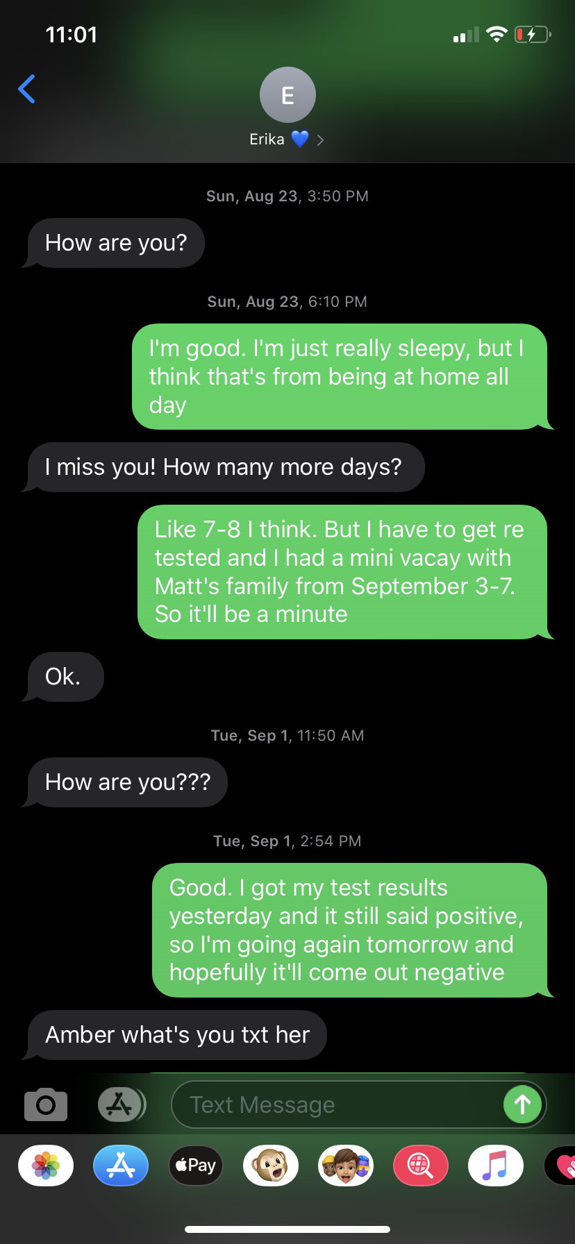 This screenshot is a routine "how are you?" text I got from one of my coworkers. She is a mother figure at work, and always made sure to check on me and keep me updated on work drama, updates, and just positive thoughts. She knew I was bored and made it a point to have a conversation with me almost every day. I was so bored because I was a lucky case and barely had any symptoms. I'm a healthy, twenty-two year old who caught it after taking a trip to Iowa to visit some friends. The whole group had it and it varied on the severity, but no one was affected too badly; although, one girl did lose her sense of taste for three weeks. My boyfriend and I were holed up for nearly two and a half weeks, due to waiting for negative test results for job-return purposes. While my boyfriend had symptoms that kept him in bed for a week, I simply lost my taste, had a stuffy nose, and minor body aches. I was very lucky because I could barley tell I was sick, and after 3-4 days everything cleared up except my sense of taste, which lasted a week. I will always be thankful that I didn't experience a bad case and that all my friend were okay after.