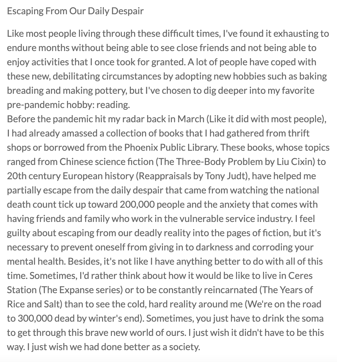 Before the pandemic hit my radar back in March (Like it did with most people), I had already amassed a collection of books that I had gathered from thrift shops or borrowed from the Phoenix Public Library. These books, whose topics ranged from Chinese science fiction (The Three-Body Problem by Liu Cixin) to 20th century European history (Reappraisals by Tony Judt), have helped me partially escape from the daily despair that came from watching the national death count tick up toward 200,000 people and the anxiety that comes with having friends and family who work in the vulnerable service industry. I feel guilty about escaping from our deadly reality into the pages of fiction, but it's necessary to prevent oneself from giving in to darkness and corroding your mental health. Besides, it's not like I have anything better to do with all of this time. Sometimes, I'd rather think about how it would be like to live in Ceres Station (The Expanse series) or to be constantly reincarnated (The Years of Rice and Salt) than to see the cold, hard reality around me (We're on the road to 300,000 dead by winter's end). Sometimes, you just have to drink the soma to get through this brave new world of ours. I just wish it didn't have to be this way. I just wish we had done better as a society.
