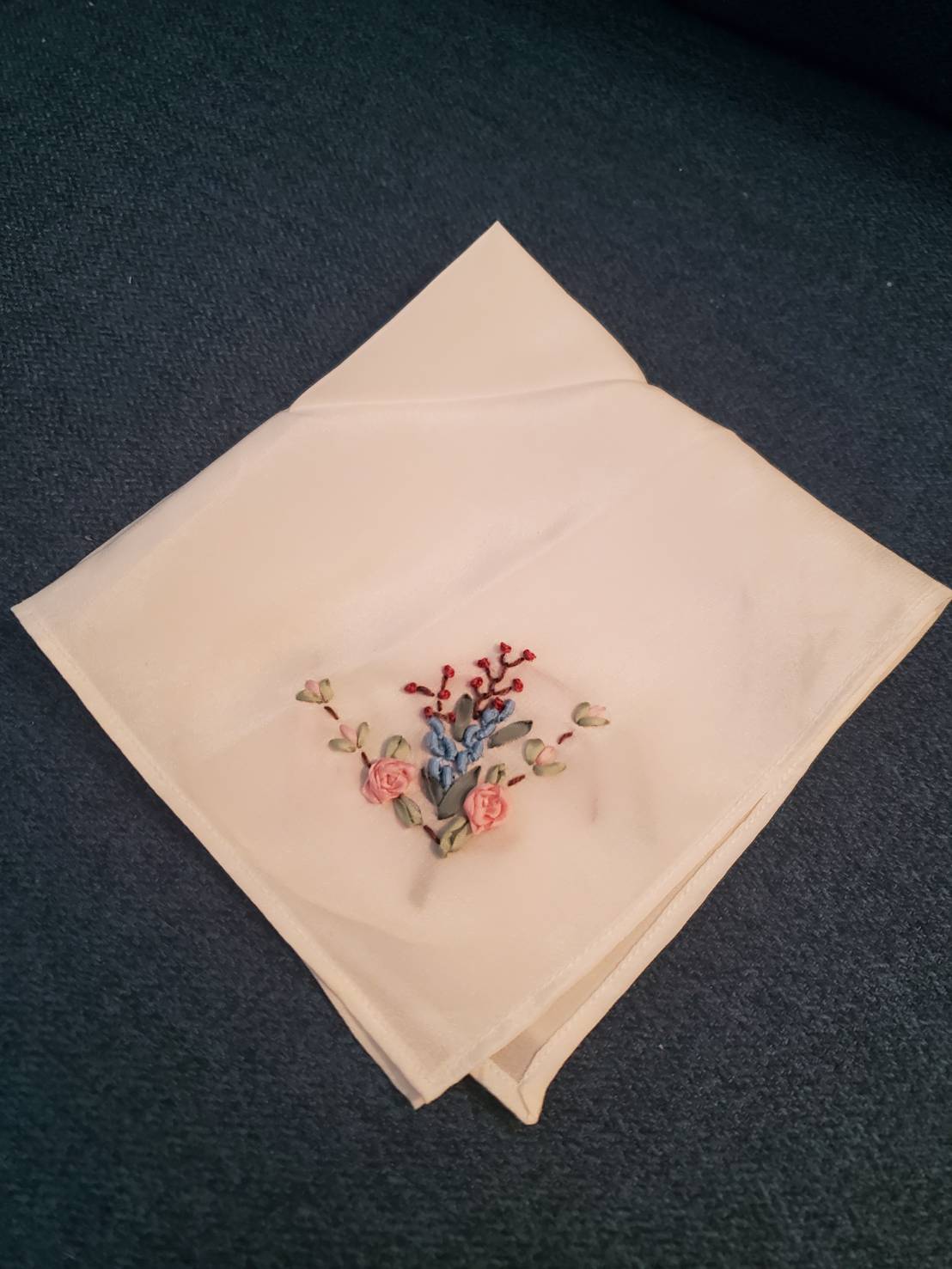 This particular kit involved ribbons, something I had never worked with before. The handkerchief took longer to complete than it probably should have, especially since it was such a small area, but I got it done even if it wasn't perfect. Although it was such a small thing, working on this handkerchief helped take my mind off of things and alleviate my boredom for at least a little while.