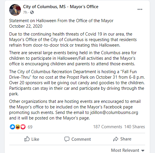 The Mayor of Columbus, MS, Robert Smith, and his office issued a public notice on October 22, 2020 that there should be no door to door trick or treating. In place of door to door trick or treating the city and fellow organizers have planned events for trick or treating throughout the city. This action is helpful and thoughtful for all citizens involved. It allows the citizens to remain safe in their homes if they so wish or it gives citizens the opportunity to celebrate Halloween during the pandemic. Of course social distancing will be practiced for all Halloween events. This is important for children to celebrate a fun holiday while practicing social distancing. Also important to realize the safety and health conditions for others that are at high risk for Covid 19.