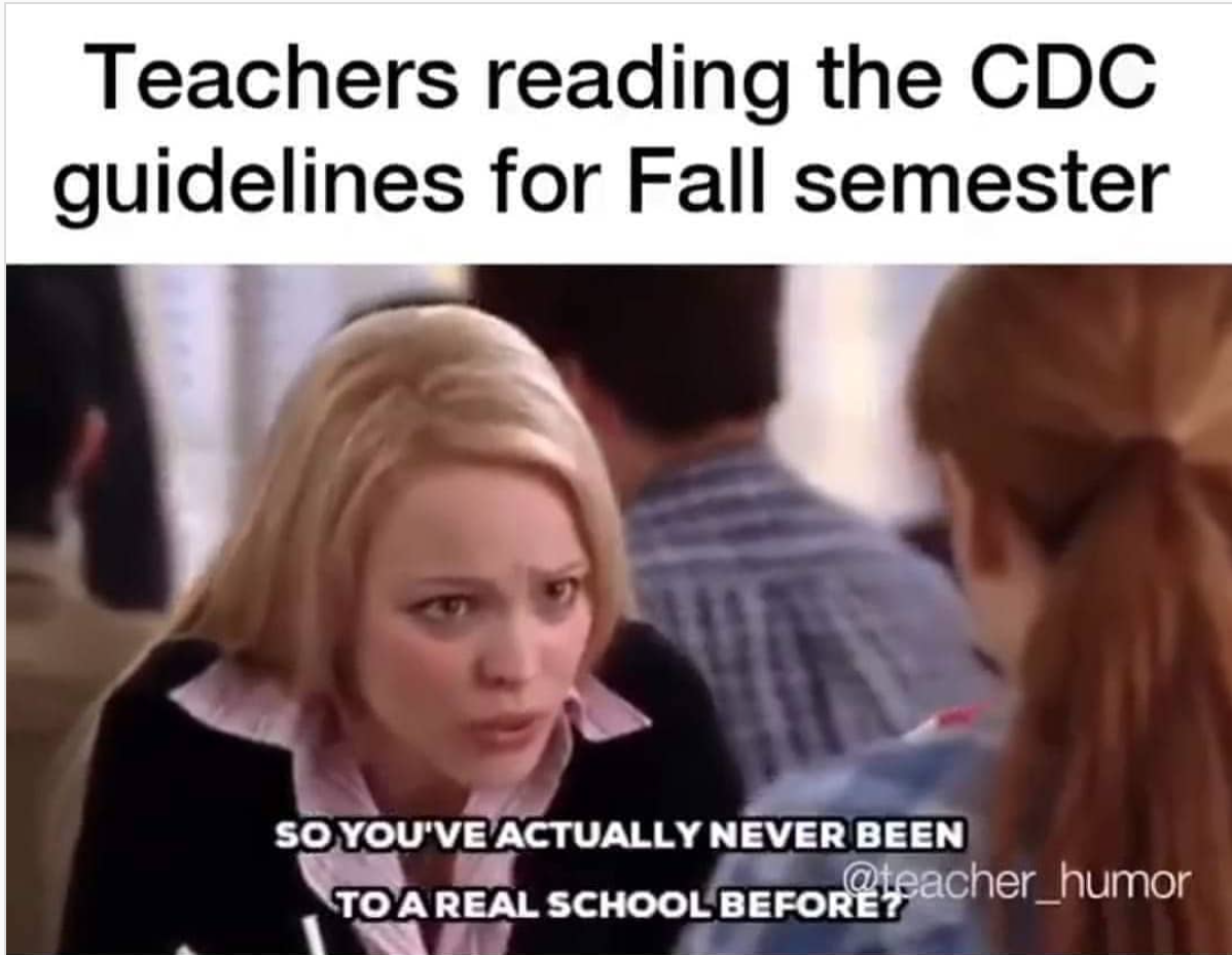 I like this meme because when the CDC came out with initial guidelines everyone who has been in a classroom was surprised. Anyone, especially teachers and administrators, know that its next to impossible to keep students 6 feet apart and stay in one desk. The initial guidelines, and even some of the current ones, are next to unrealistic for a school environment.