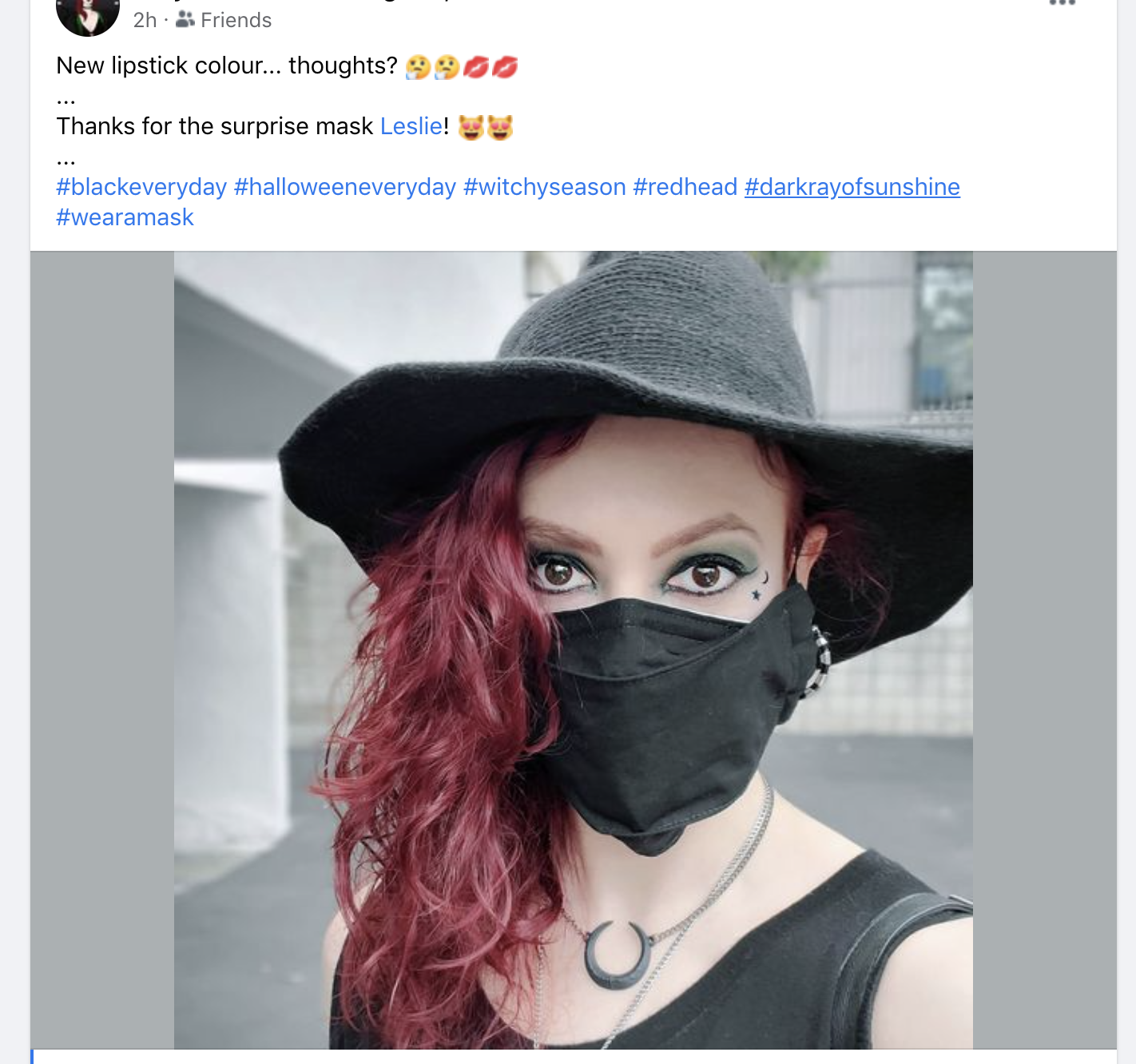 I don’t think I’ve worn jeans, or really anything other than leggings and t-shirts since I started social distancing. I’m pretty sure my makeup drawer hasn’t even been opened since March. I wear a mask when I go grocery shopping, so why even bother? A friend of mine shares Facebook and Instagram posts nearly everyday of herself wearing makeup and a mask that matches her outfit. As you can see from the photo she allowed me to screenshot, she adapted her need for social responsibility to fit with her own personal style. I think it’s time to feel like myself again; maybe get matching Sword Art Online masks for my daughter and I.