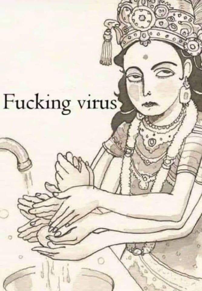 This meme depicts a Hindu deity with multiple arms, expressing his annoyance at having to wash all of his hands in order to avoid getting sick or spreading the virus.