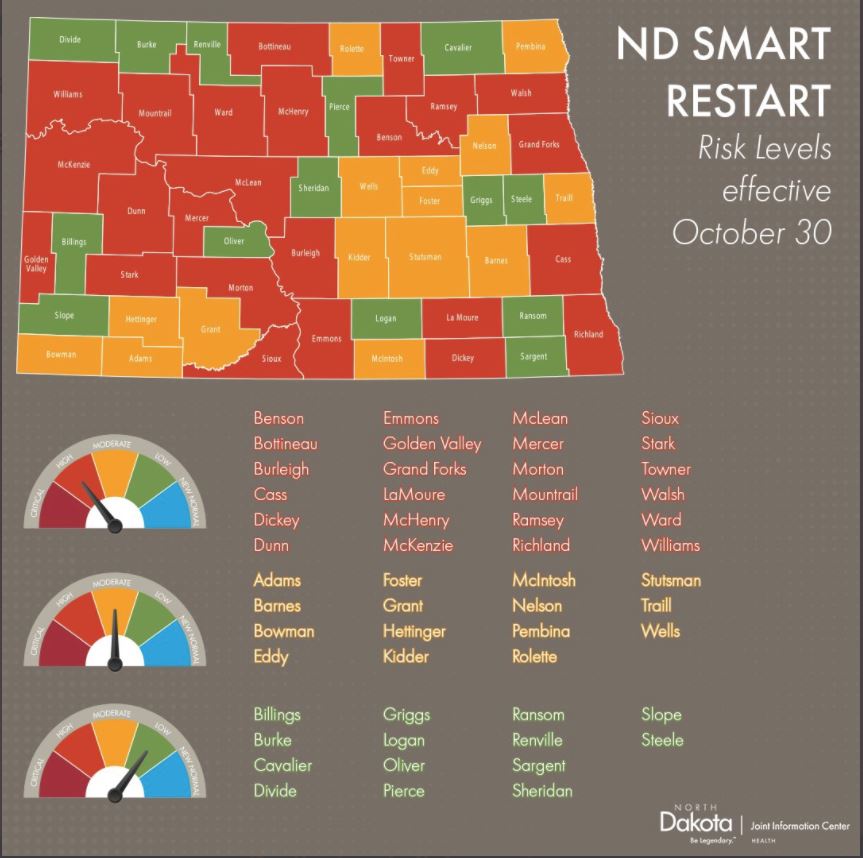 In the early stages of the pandemic, North Dakota shut down like every other state. However, during reopening over the summer, safety protocols, such as masks, were not state mandated, only recommended. This has led us to being the state with the highest cases of COVID in the U.S. right now. During Governor Burgum’s press briefing on October 29, 2020 he adjusted the COVID-19 risk levels for various counties in North Dakota, bumping nearly half of the counties in the state into high risk categories and a quarter of the rest into moderate risk. Governor Bergum is still not pushing for a mandate on wearing masks in public areas, only recommending it.