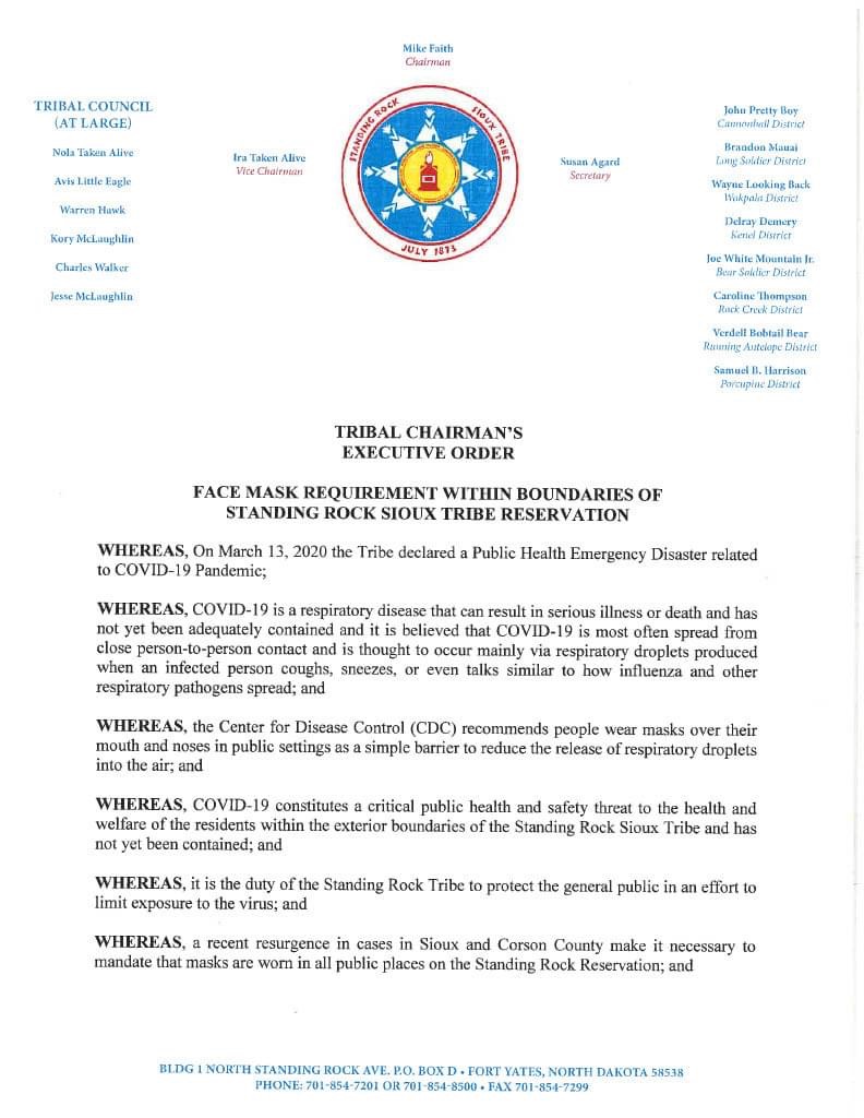 On October 27, 2020, Chairman Faith of the Standing Rock Sioux Tribe issued an Executive Order mandating the wearing of face masks within the boundaries of the Standing Rock Reservation. The COVID-19 pandemic has hit the hardest among minorities, including Native American tribes. With COVID numbers increasing in the Dakotas, it is no surprise that the local tribes are cracking down on safety measures. The protection of their people and culture will always be their number one concern.