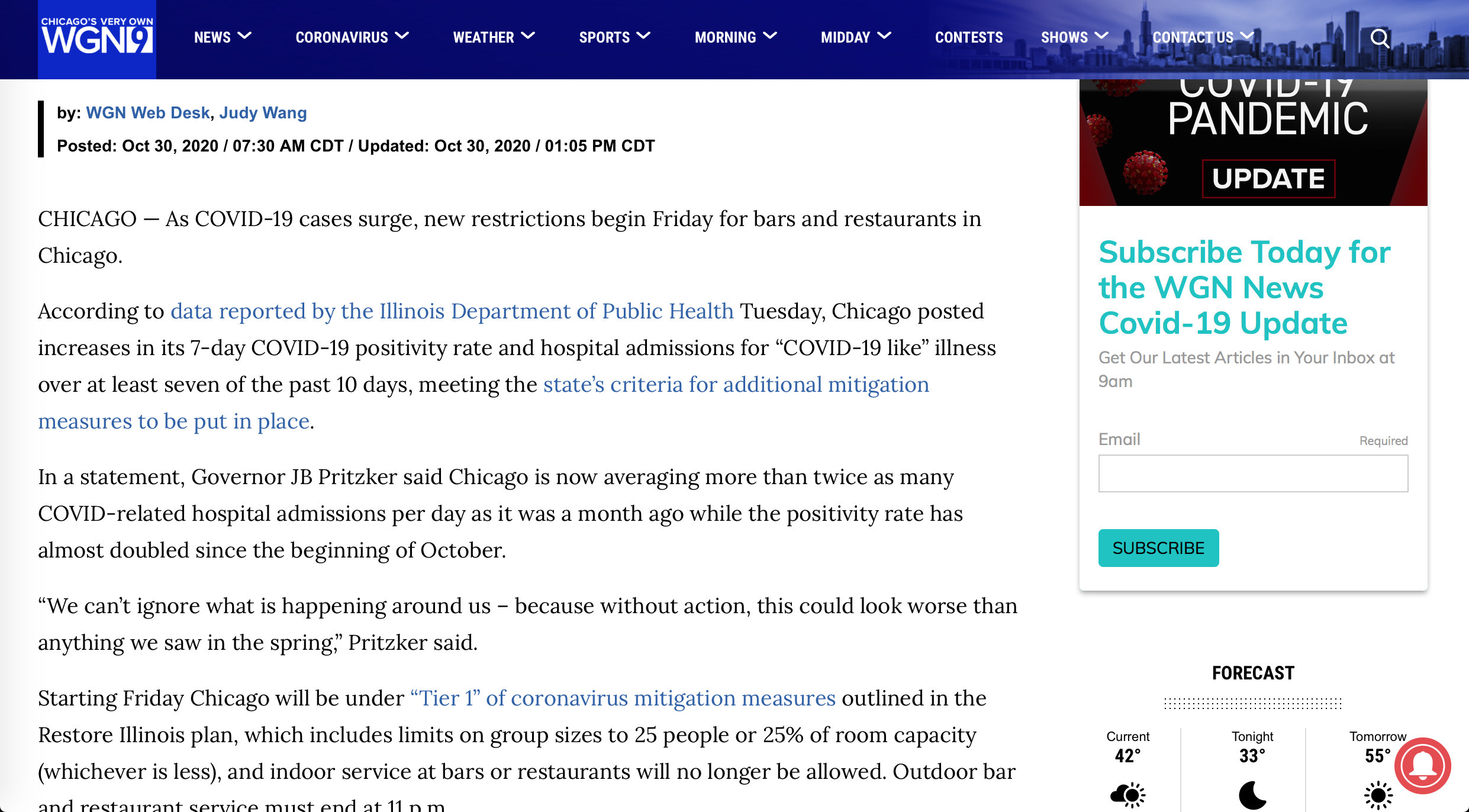 This shows how vulnerable we are as a country to covid 10 months in. As many restrictions were lifted in the summer, almost as quick as the summer heat was gone more restrictions were placed on restaurants. As many attempt to figure out some way to have outdoor dining in Chicago, in the winter, many know that the end is near. Many restaurants barely were making ends meet with the limited capacity seating and take out, and this latest round of restrictions will be too much for many restaurants to overcome.