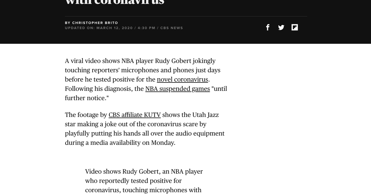 The NBA was considering a stoppage of games due to the outbreaks of COVID-19. During one of the press conferences a player named Rudy Gobert decided to touch all the microphones in the press room after speaking with reporters, within days the world learned that he had contracted Covid-19 and the sports world began shutting down all sports, including NCAA tournament and all sports around the world. Gobert was one of the first celebrities to contract COVID-19.