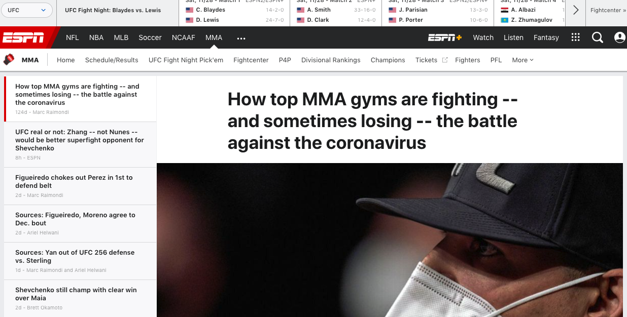 This article shows the difficulties and last minute changes that professional MMA fighters are facing during this pandemic. I remember seeing the cancellations mentioned in the article as well as others. In MMA there is always a feeling of never being sure if a fight will go through until the weigh-ins are done because of the possibility of injury. The pandemic and the virus have added another possible cause of cancelation for fights. One that the fighter may have no control over.