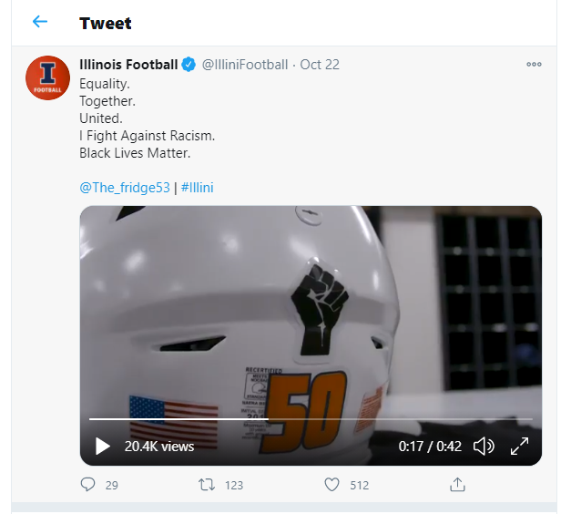 The Tweet declares that the University of Illinois, The Fighting Illini, are in support of social justice. The college football team is supporting the Black Lives Matter movement by wearing black decaled insignias on their helmets with the Black Lives Matter fist symbol on the back of the helmet. The fist is a powerful gesture associated with the social justice protest. The video also states that football is just a game and social justice is a real world priority. A college football team and university realizing the fight against racism and social inequalities is more important than their institution is a significant event in the fight for social justice. Of course not all fans or comments think it is appropriate for the team to wear these symbols but all movements will have discourse in their pursuit to fight for social justice. This statement to display these images are closely related to how far the protests have come in the fight for social justice.