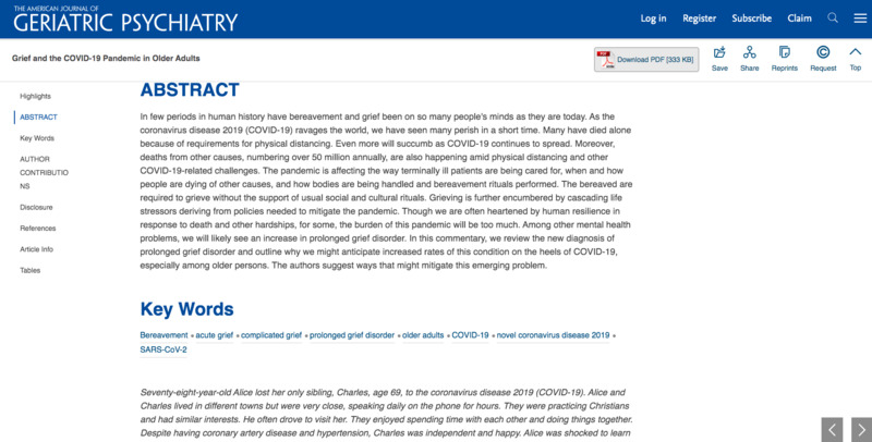 This is a journal article from The American Journal of Geriatric Psychiatry (AJGP) that examines the following: how older adults cope with losing a loved one, risks associated with prolonged grief, challenges of social distancing, pandemic-related stress, and using telehealth visits as a preventative measure.