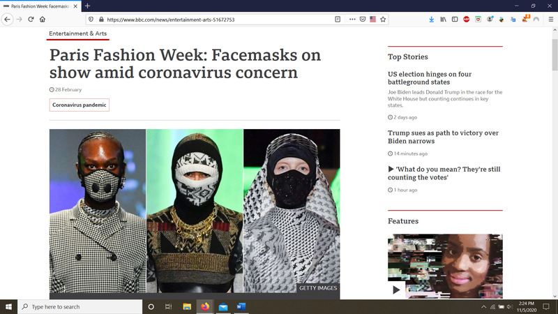 I chose this piece of media because this shows the intertwining of the government's edict to wear masks and fashion. This made me realize two things- first was that even in a pandemic like this, people still do want to improvise and try to earn money and secondly, beauty and fashion is what makes life worth living, as even in such a tumultuous time such as now, we find a way to overcome and make the world a brighter place;people will always find a way to put fashion and style in everything even in such a dangerous time as this. We see people even taking advantage of this new business venture, as when I was strolling around in Caesar's Palace, I saw a store selling Covid-19 related fashion clothes such as those in the picture above. This seems to be a compromise of the people and the government- "ok, we'll wear masks, but don't take it(the fashion) away from me!".