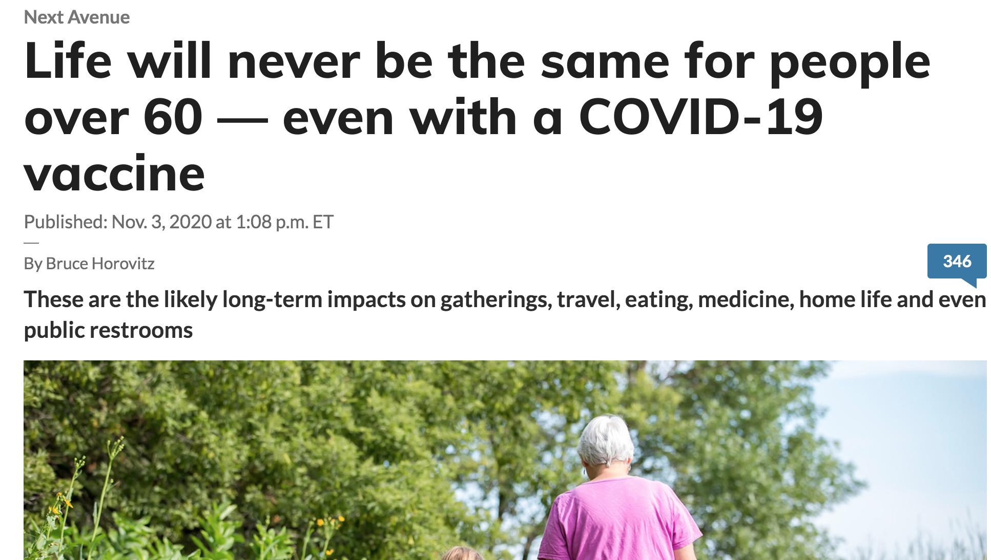 I chose this because it specifically talks about what life for people over 60 after COVID-19 could be like. Most of other items I have seen have been what life has been like during the pandemic. Telemedicine will become more popular or common for the elderly as it has been a common precaution used during the pandemic. Traveling will change in ways like more driving, buying three plane tickets for two people to help social distance and many more. Online ordering of food, groceries, and even common shopping trips will be done online or have online delivery.