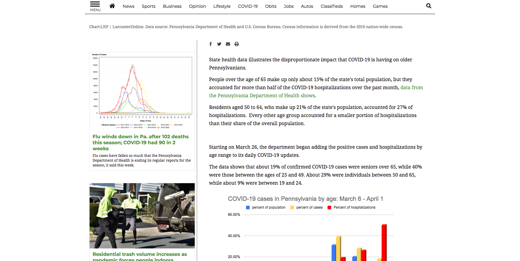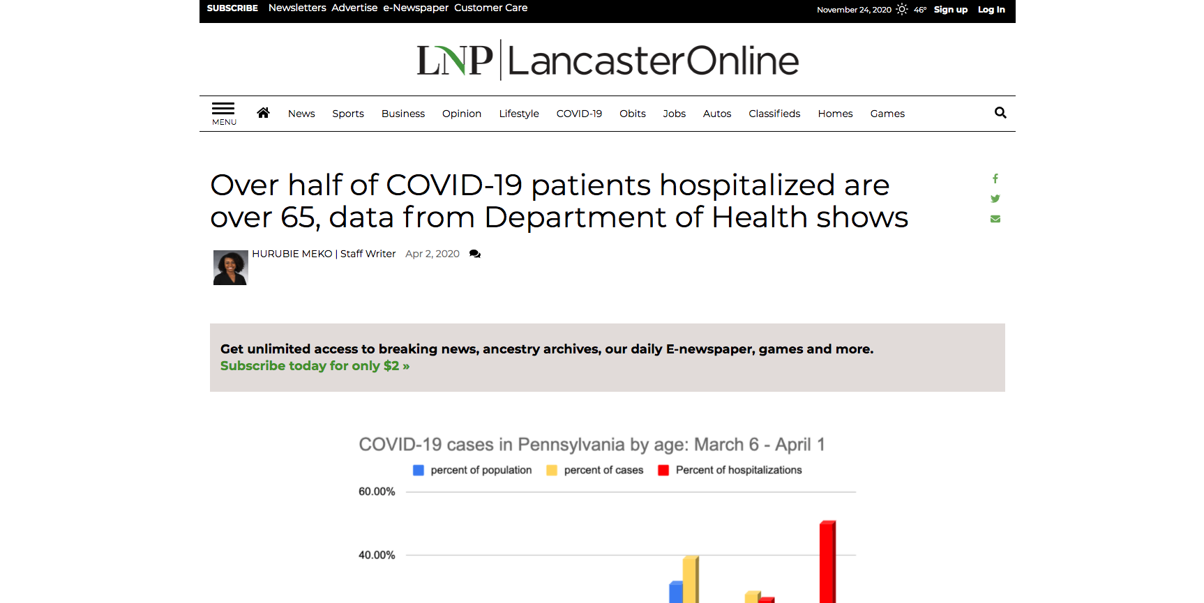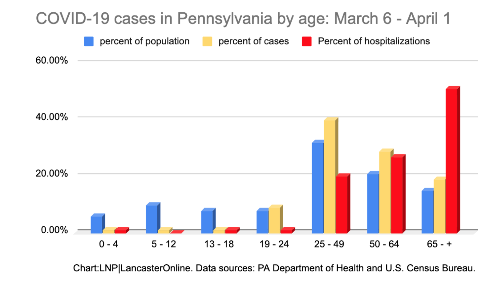 Graph shows the percent of population in blue, percent of cases in yellow, and percent of hospitalizations in red for cases in Pennsylvania. All the bars from ages 0-24 are quite low in all three categories. However from ages 25-65+ increase in all categories. The percent of hospitalizations rises drastically for ages 50-65+. While their percent of population and percent of cases are low they are the age group more likely to need hospitalization.