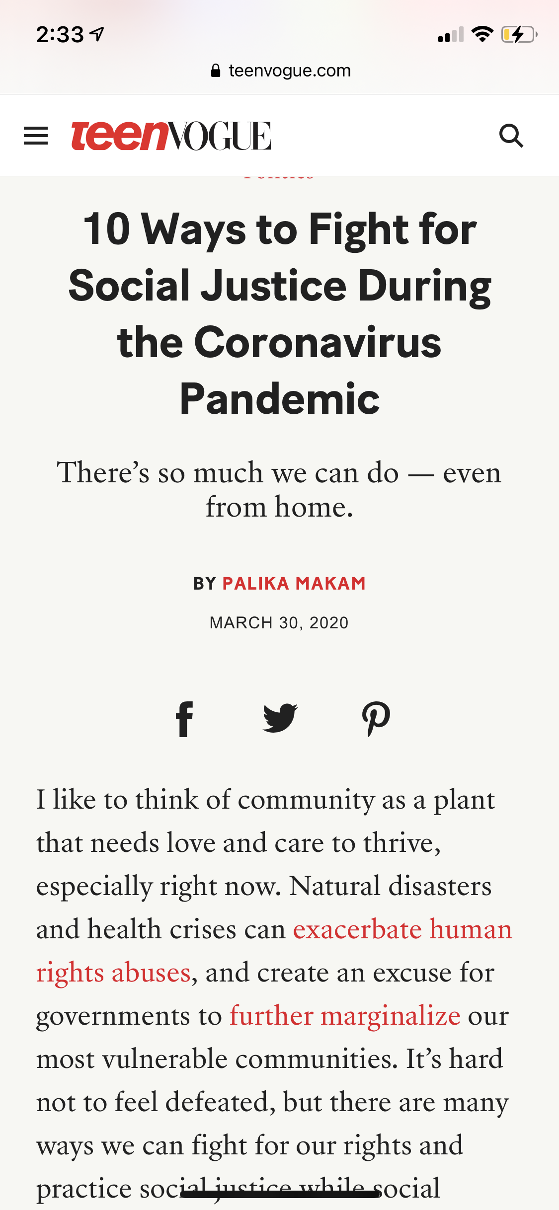 I found this article on Facebook at the beginning of quarantine in the United States. This article explains how to be an ally and stand up for social justice during a pandemic. At the beginning of COVID-19 spreading to the United States, there were an abundance of stories discussing how Asian people were targeted and harassed for the spread of COVID-19. This article, from Teen Vogue urges young adults and teenagers to stand against social injustice and gives advice on ten ways people can help