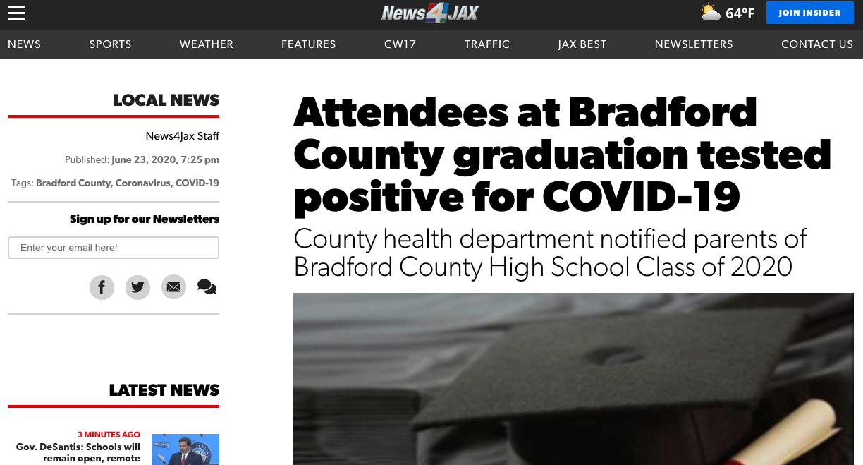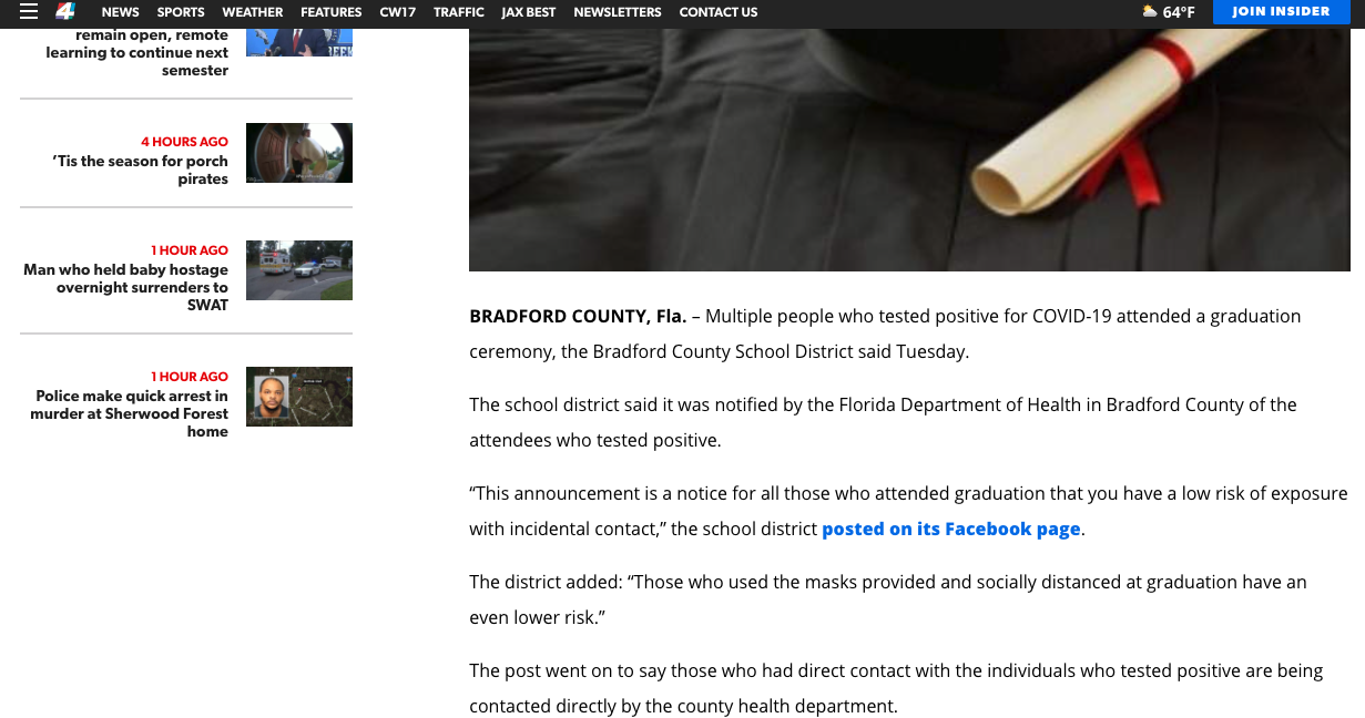 This is a story about a high school graduating class that had an in-person graduation and shortly after, someone tested positive for COVID. I found this online on a local Jacksonville news station which had a link to the school’s Facebook page.