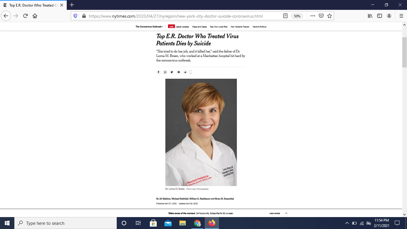 An emergency room doctor in New York committed suicide while staying with family in Virginia. Her family say she had become detached, and spoke of the horrors she saw while working with coronavirus victims. Her family would like her to be remembered as a hero. The doctor's family has set up a foundation that gives mental health support to health care providers.