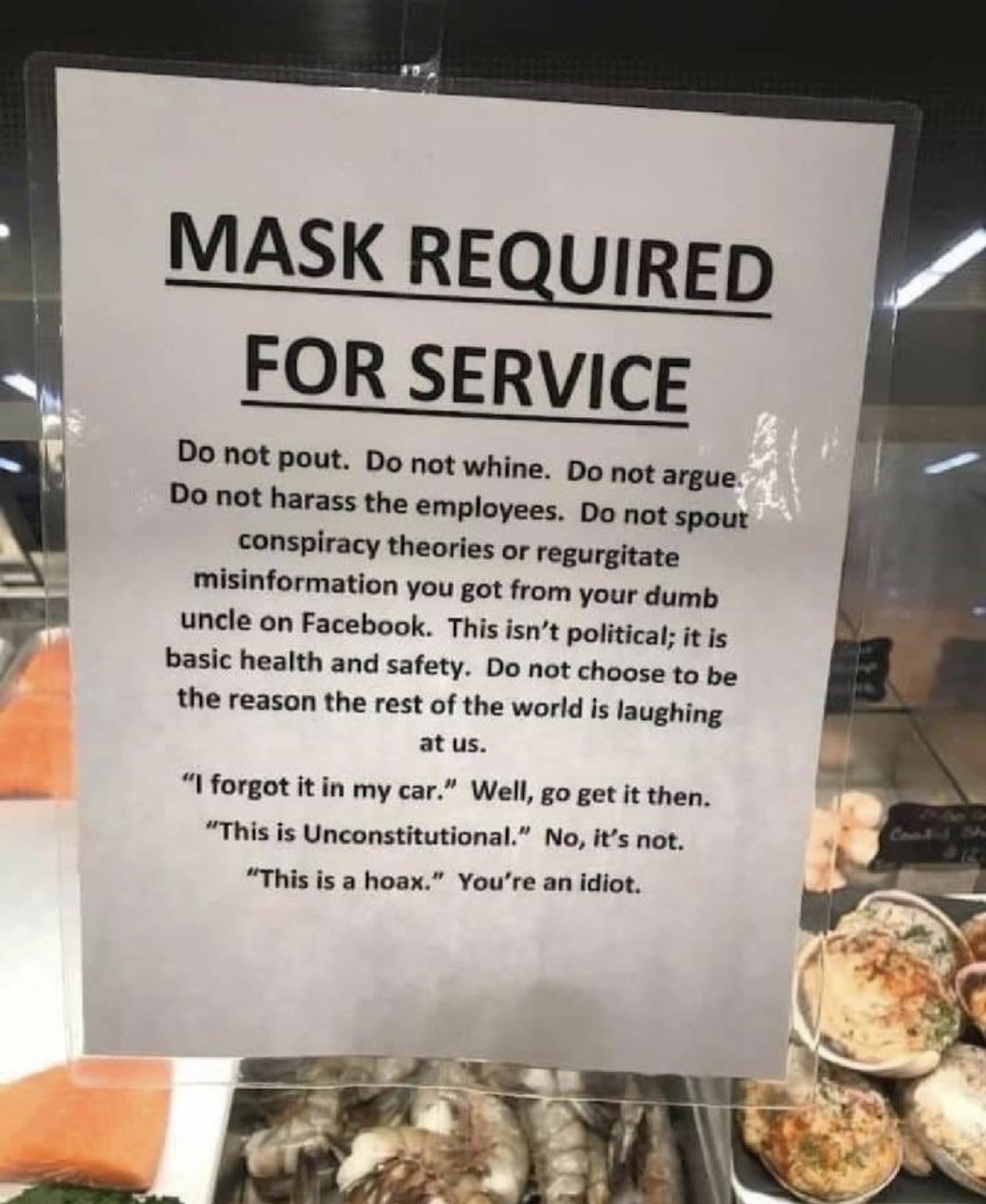 “Do not pout. Do not whine. Do not argue.” A sign inside a restaurant explaining the requirement to wear a mask while inside the location. Whether or not to wear a mask has been a surprisingly contentious issue during the pandemic, and this sign explains, humorously, the problems with the anti-mask arguments.