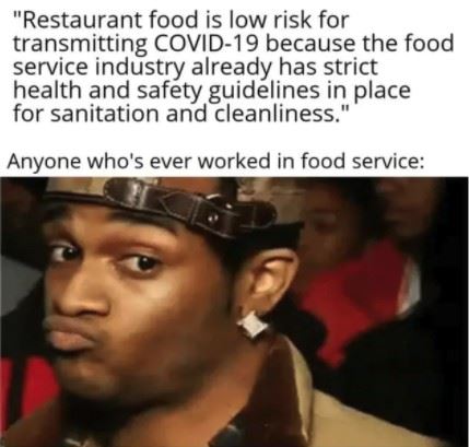 A meme describing the safety of food in restaurants, with a face of doubt implying that food service standards for health and cleanliness are either insufficient, or not followed.