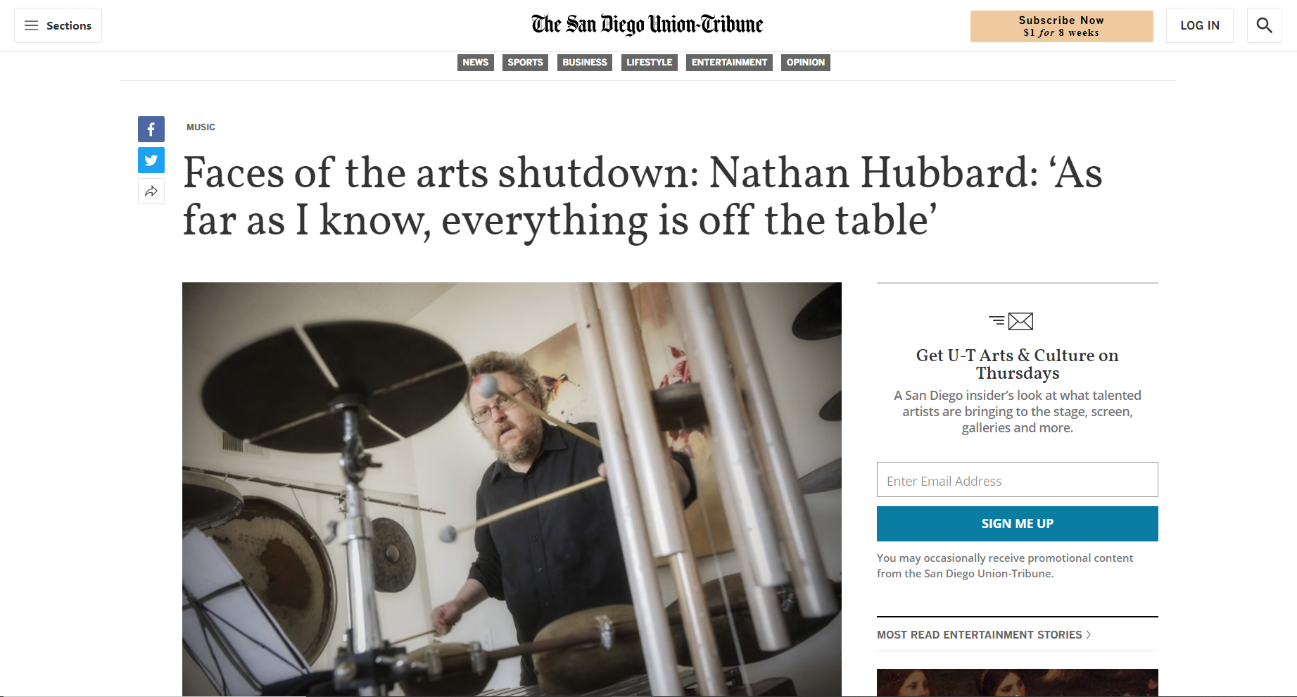 The San Diego Union-Tribune has published a short series chronicling local musician's experiences and struggles during COVID-19. This story is about drummer Nathan Hubbard and how he has gone from performing almost every day to having very little work.