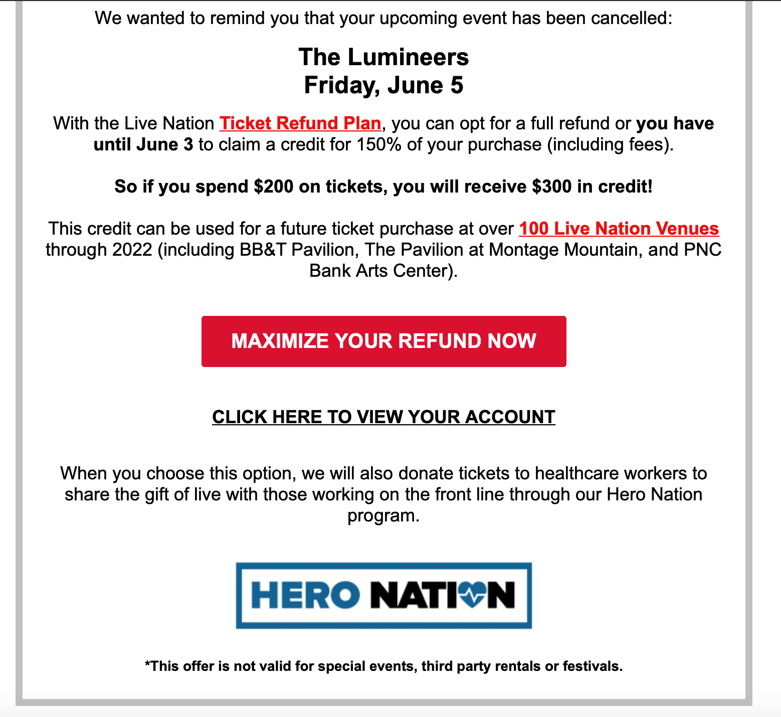 The image I have concluded is a screenshot of the email that I received from BB&T Pavilion detailing that the concert was cancelled, but I had the option to donate my tickets to healthcare workers on the frontline. While I am upset that I was not able to attend the concert in June, I believe that healthcare workers should be compensated for their time, sacrifice, and devotion to the betterment of our society through their tireless efforts in healthcare. This option is a perfect example of how individuals can give back to members of our society that are fighting to end the COVID-19 pandemic and to acknowledge their progress and effort to keep every person safe from sickness.