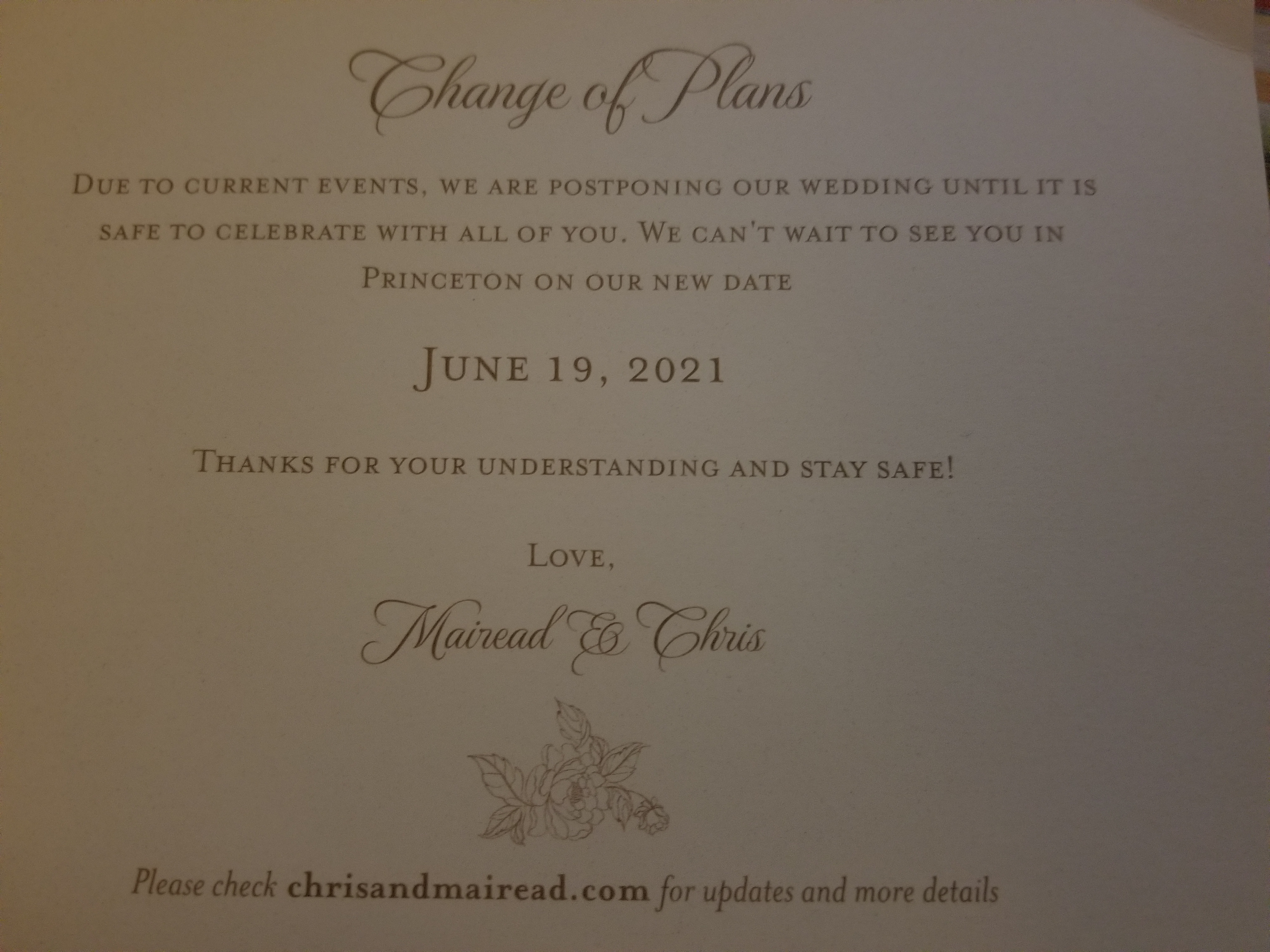 A notification that a wedding at which my entire family had been planning to gather will be delayed an entire year due to Coronavirus concerns.