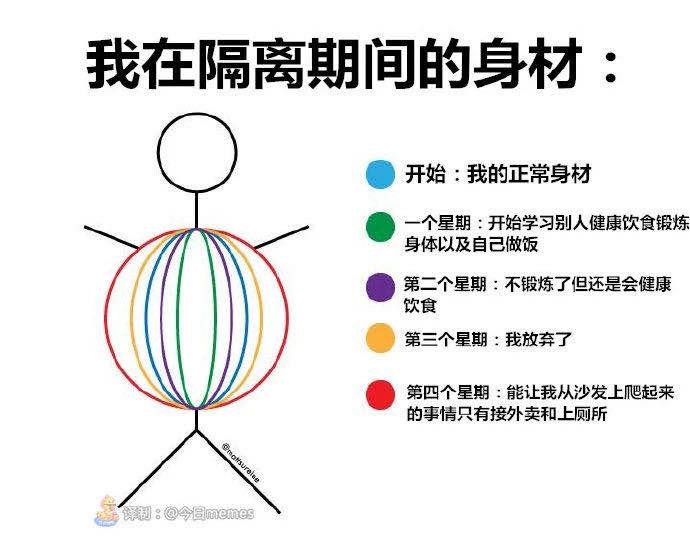 Meme joking about body shape changing during the quarantine. The first week, trying to be healthy and doing exercise, might lose some weight; the second week, stop exercising but still trying to eat healthy food, gain some weight but still skinnier than the beginning; the third week, quit healthy food and gain more weight; the fourth week, the only thing that can let me leave my couch is to use the bathroom and get food delivery.