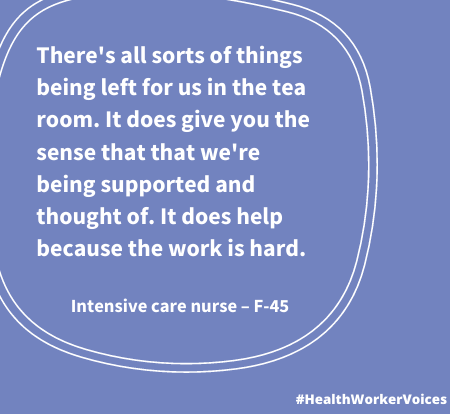 Quote from Female aged 45, Intensive Care Nurse. Image created by the Health Worker Voices project: https://mspgh.unimelb.edu.au/healthworkervoices