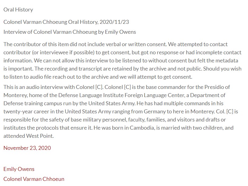 Interview of Colonel Varman Chhoeung by Emily Owens