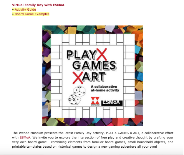 This comes from the #WendeOnline programming that started at the beginning of COVID-19. One facet of #WendeOnline is a monthly family day. They hosted a family day in pre-COVID times so this is an example of a direct translation from in-person to online programming. For June, the Wende collaborated with ESMoA to provide instructions on how to create a board game. The activity was called PLAY X GAMES X ART and encouraged families to design a game of their own based on household objects. They also provide a template in the pdf attachment that is based on historical games. While building a board game aligns more with the mission of ESMoA, it does loosely apply to the mission of the Wende. In my opinion, it is more important that the activity is collaborative and engaging than it directly relating to the subject matter of the museum. This event is different from most of the family day activities in the fact that it does not have an obvious link to history. Despite this, I think it is a unique way to engage with “visitors.” After making the game, families can continue to play it for a long span of time. Even once they’re done with the official family day activity, the experience can last longer. This is a great example of building a community within a household and between museums. This is important to me because this was a museum I went to in pre-COVID times and it is nice to see they are still building community.