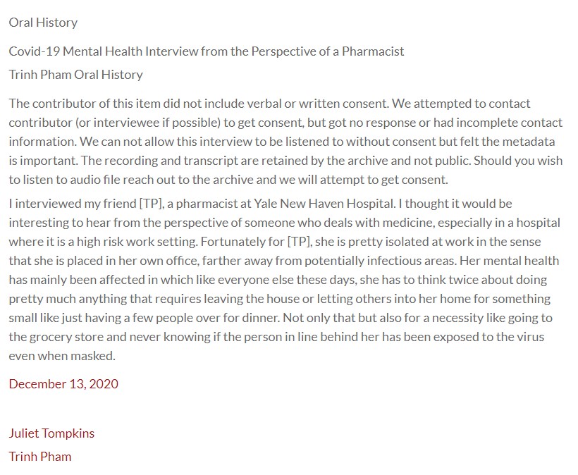 This item was submitted on December 14, 2020 by Juliet Tompkins using the form “Share Your Story” on the site “A Journal of the Plague Year”: https://mail.covid-19archive.org/s/archive