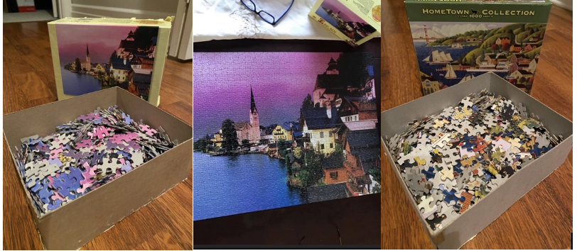 To me puzzles were nothing more than the stack of boxes collecting dust in the top shelf of the coat closet. Maybe I took them out once or twice when I was in grade school while I was looking for something to do after using up all of my TV time and refusing to pick up a book. I don’t recall every shopping for my puzzles, receiving them as gifts, and now that I think about it, I don’t recall ever finishing one besides, of course, the twenty-four-piece pink Hello Kitty puzzle, of her walking her dogs in the park. Now I look back upon the entire month of March spent working on multiple thousand-piece puzzles, finishing every puzzle I could find in my household.