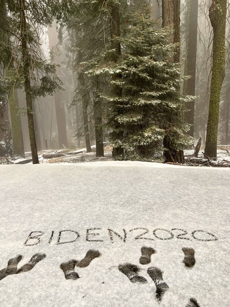 These photos represent my experience of the day that Biden was declared president-elect. I happened to be near a family member during the election, so I stayed with them, so it was easy to have access to watching the news, but after four days of being glued to the results, I needed to get back on the road for my own sanity. On the morning of the 6th, I felt confident enough in the numbers in Georgia and Pennsylvania that they were going to continue to be in Biden’s favor to leave service behind and go into Yosemite national park. I wanted to be able to listen to the news while I was in the park, so I screenshot the local radio stations while I still had service, but they all ended up being either conservative stations that weren’t reporting on the results, or Spanish speaking stations. The next day I woke up to the news that the associated press had called the election for Biden, and celebrated in Giant Sequoia National Park, while I was there, I wrote Biden in the snow as a way to celebrate and feel in community with other people also on the trails. This was an important day for American history, and while my experience was not something particularly significant, It could be an interesting story to a future historian researching how people responded to the election.