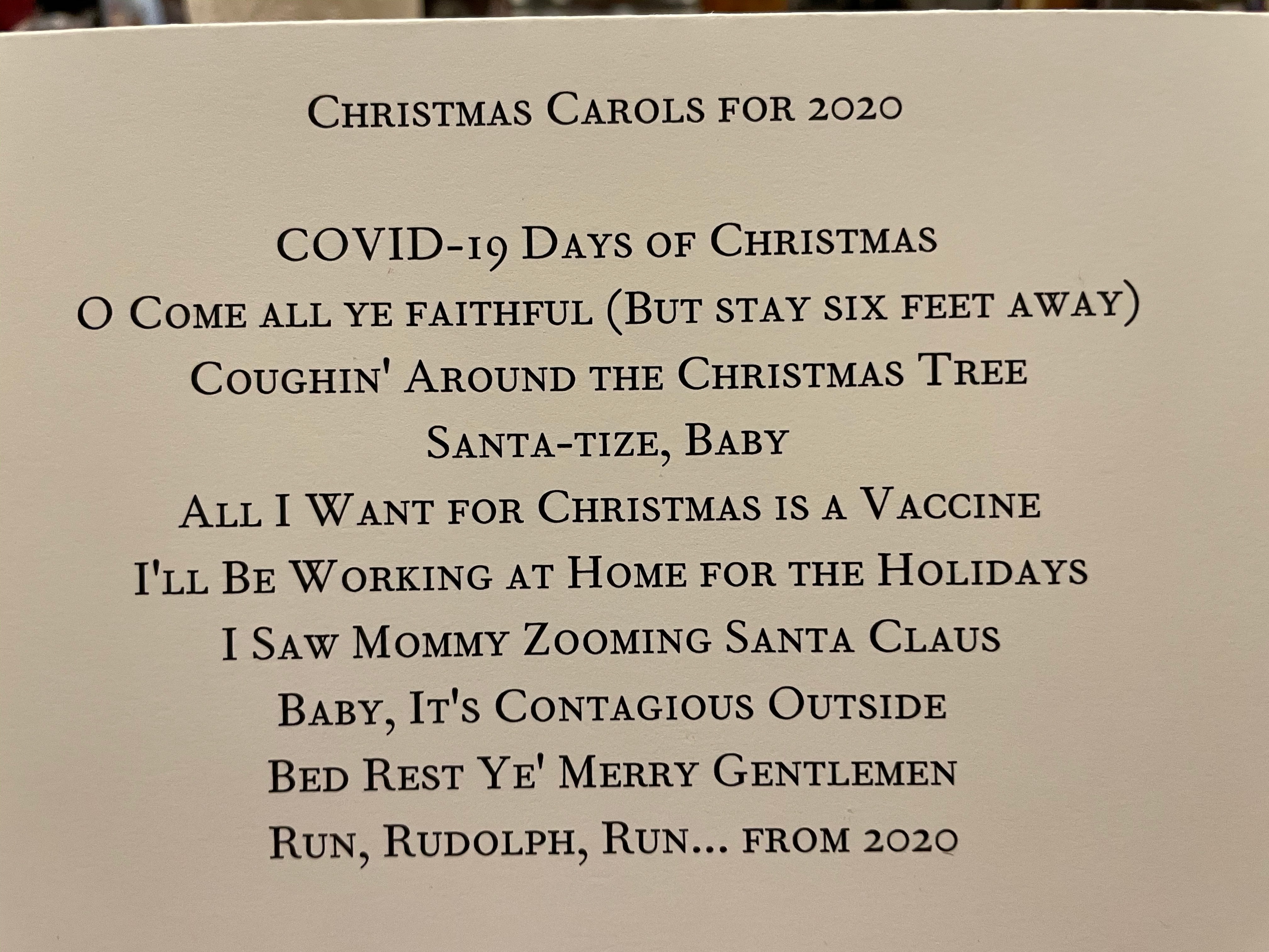 Every year, we send out a family Christmas card. The front has pictures of all of us. This year, we noticed that all of our photos have us wearing masks, so that is what we covered the front page with. Inside, we always do a funny message, so we made a list of parody Christmas carols themed after Coronavirus, the pandemic, and all of the other elements associated with it. We got lots of comments from family and friends that said they enjoyed the humor and regardless of the pandemic, they looked forward to our cards every year and knew that this year wouldn't be any different.