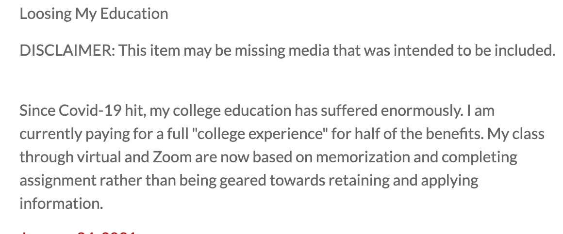 Since Covid-19 hit, my college education has suffered enormously. I am currently paying for a full "college experience" for half of the benefits. My class through virtual and Zoom are now based on memorization and completing assignment rather than being geared towards retaining and applying information.