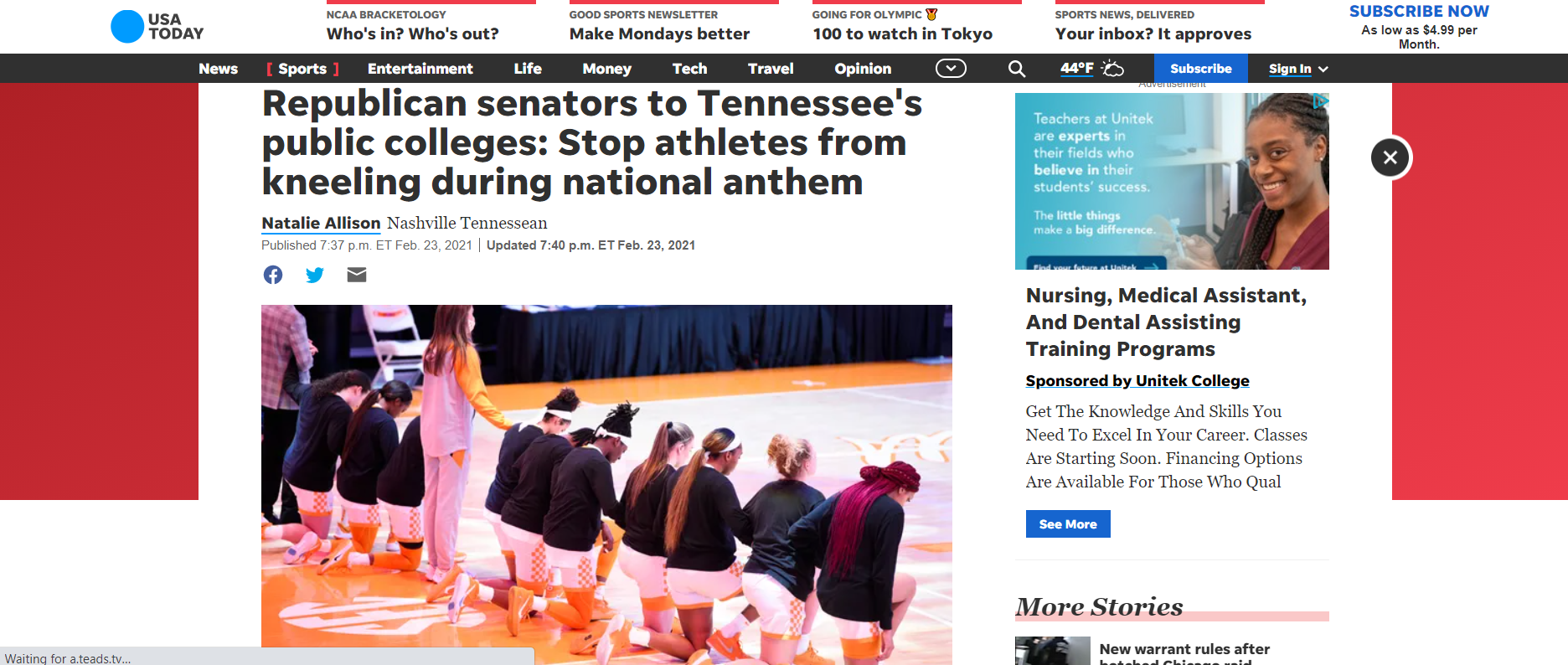 From the article: Tennessee Republicans are up in arms over a state college basketball team's decision to kneel last week during the playing of "The Star-Spangled Banner," prompting legislators to warn the public university system not to allow student athletes to do so again.