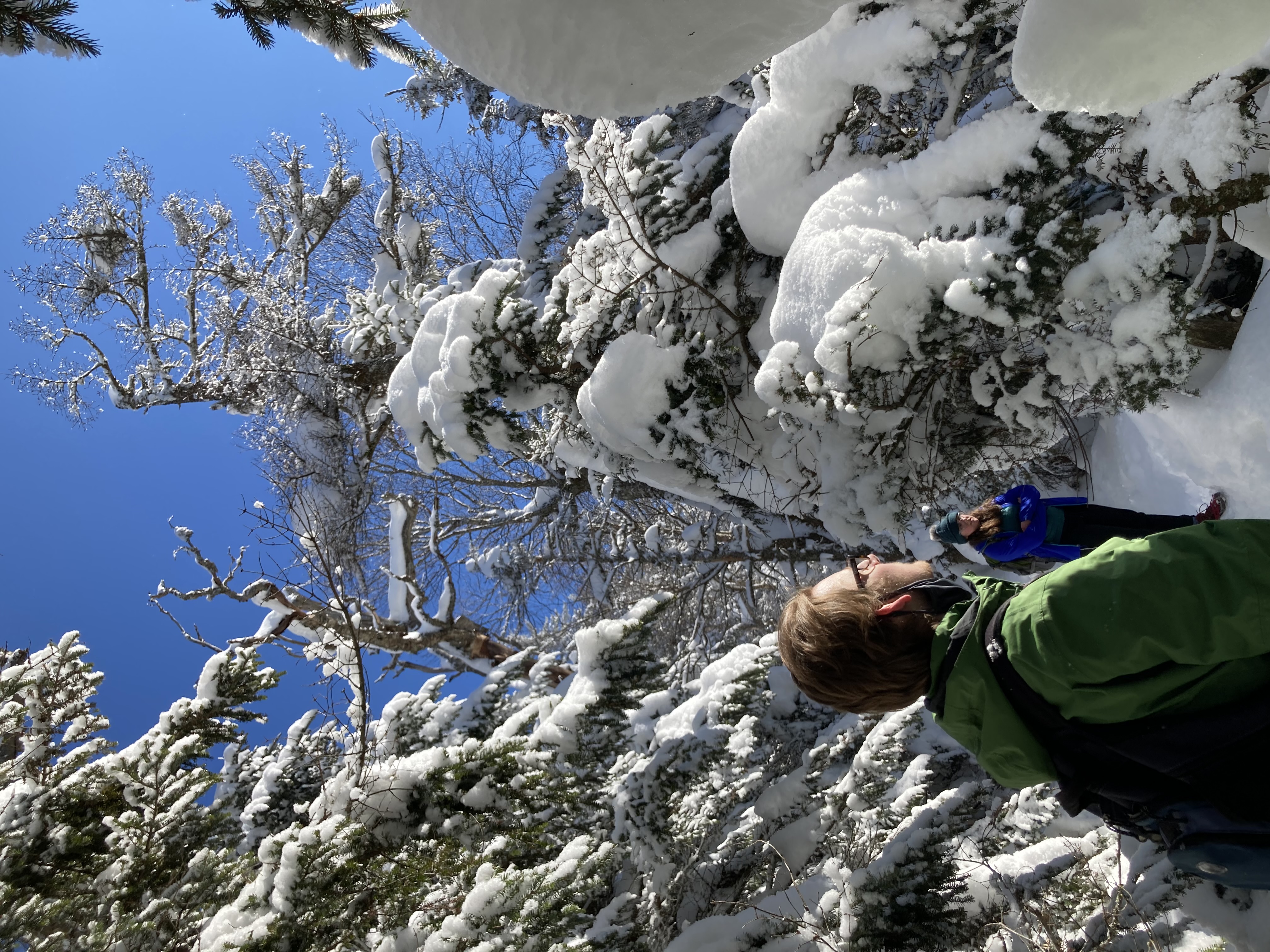 As winter crept in, we did not want to stop hiking. The microspikes next to the hiking boots allowed us to continue hiking together and remain social through the lonely winter months. The second picture was taken on February 21, 2021. It is of two of my friends taking a break on one of our winter hikes. They both have masks around their ears which they would put on when another person passed us on the trail. It was a cold day, but we prolonged the hike as long as we could so that we wouldn't have to leave each other. A month after this photo was taken, we got all got our first dose of the COVID vaccine which, a month later, allowed us to finally be together indoors again.