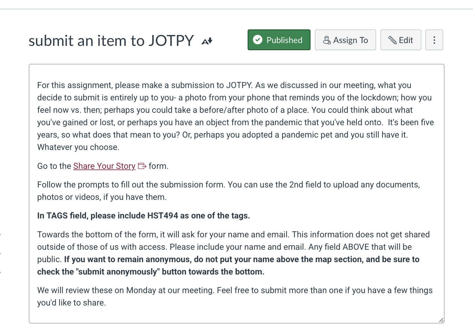 I asked my HST494 students at Arizona State University to submit an item to JOTPY prior to learning how to curate in JOTPY. There were no parameters on what they needed to submit, although we did discuss some ideas prior to submissions.