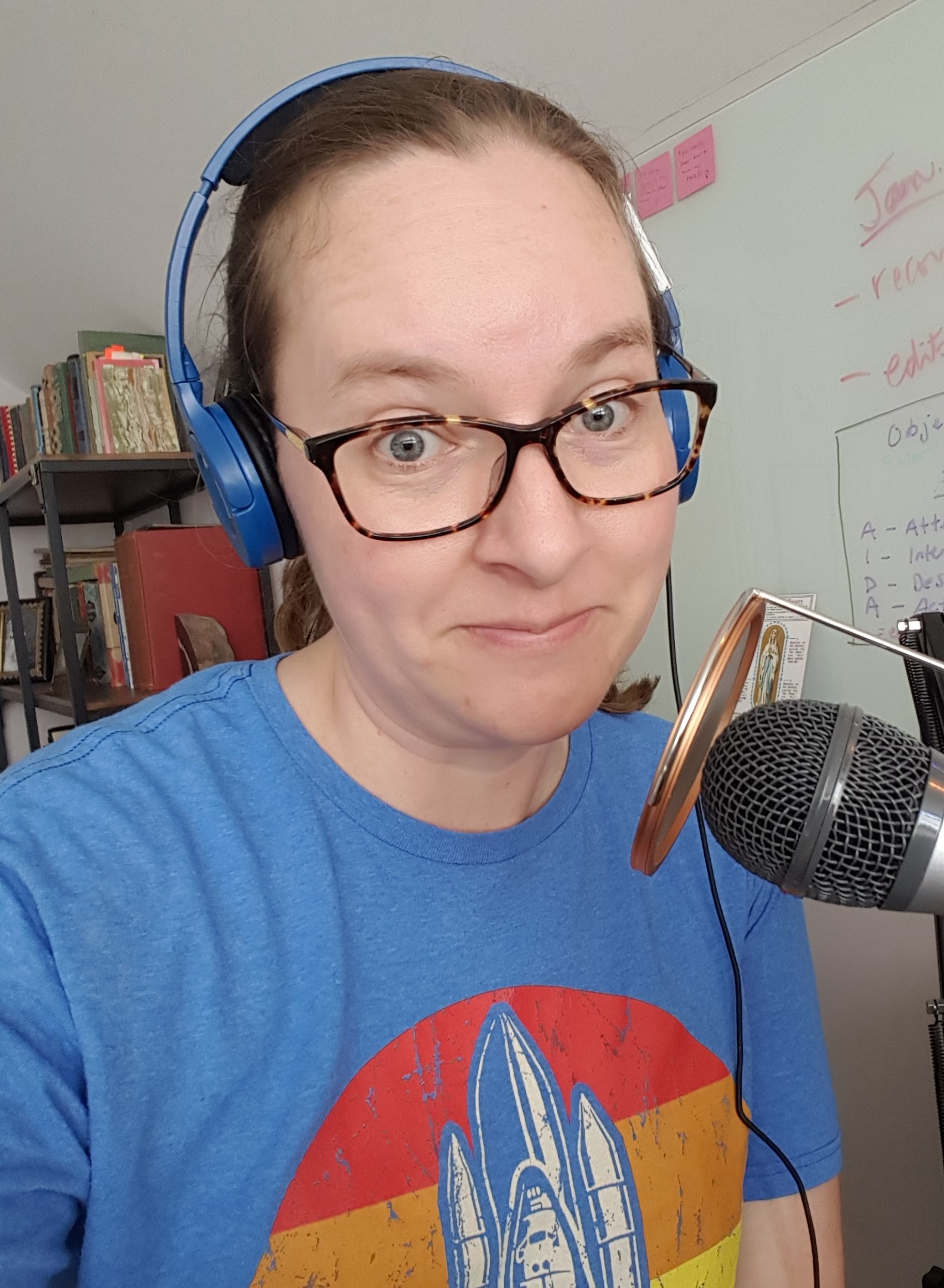 Included is a photo of myself before recording an episode in April 2020.
