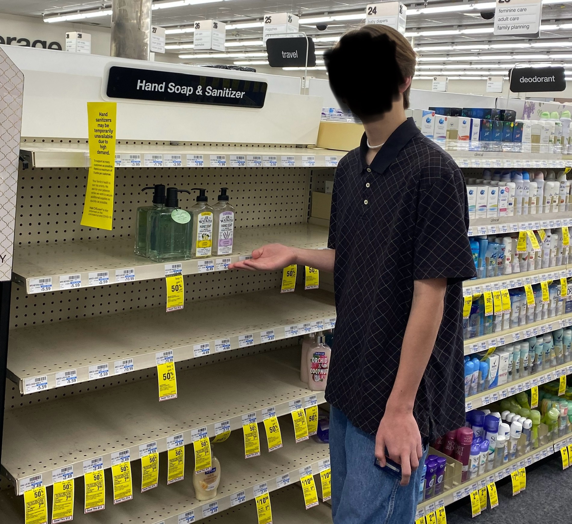 This is a photo taken of the hand sanitizer and soap shelf in my local CVS in California.