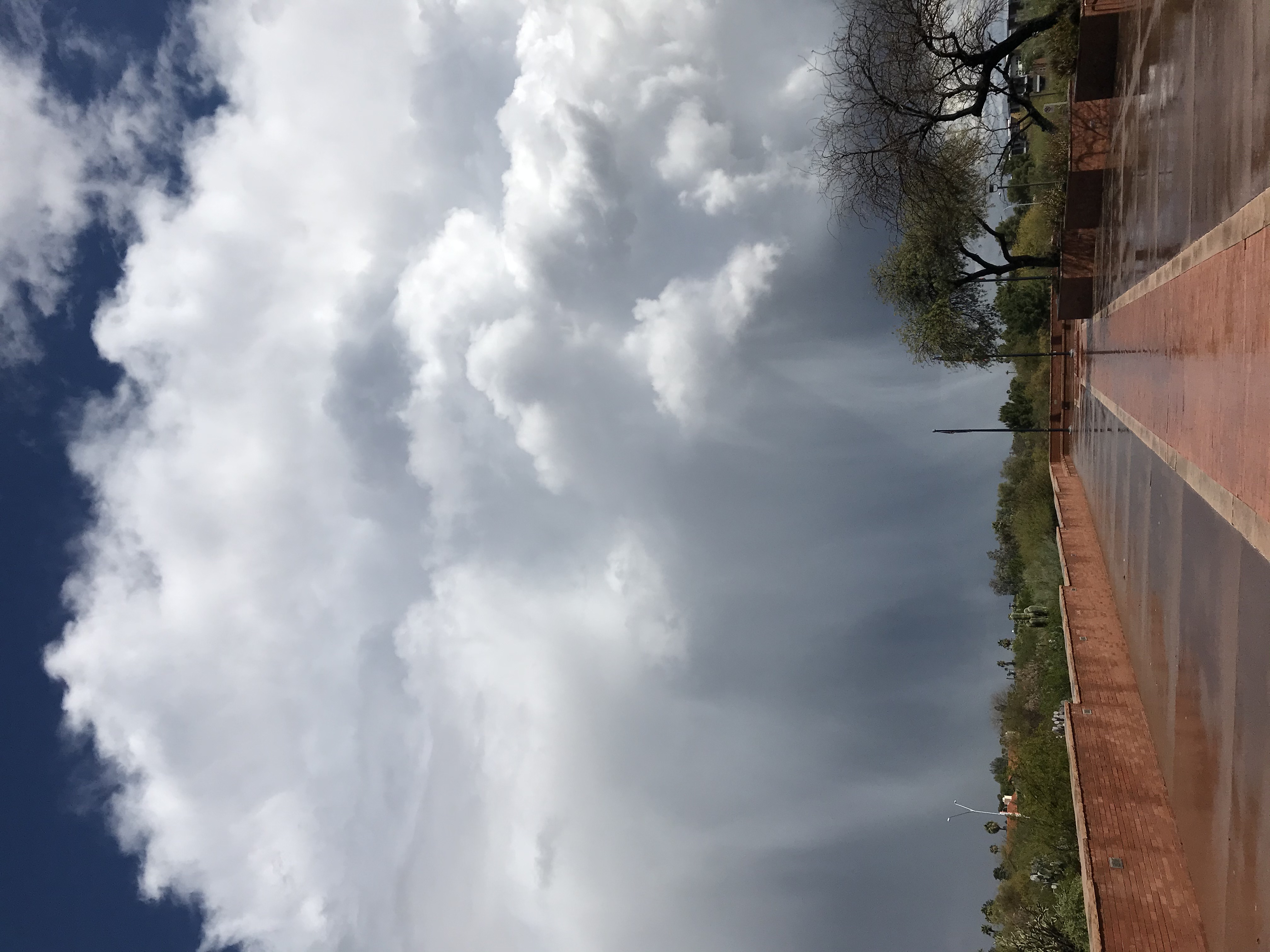 I had an oral history interview scheduled in downtown Phoenix late in the morning of Friday the 13th. I doubted whether the interview would really go forward, but had not gotten the word that it was cancelled. I booked a rideshare to head downtown for the interview. As we were headed down the freeway, a rather freakish thunderstorm started, unusual for that time of year. When I was about halfway downtown, I finally got the word that the interview was cancelled. To not waste the ride, I re-directed the driver to the Arizona Historical Society in north Tempe, where I needed to pick up some things for some other work I was doing. The historical society was open, but there were very few people there. I picked up what I needed, and decided to walk from there across the river to campus, where I could meet my wife and get a ride home. As I left, the storm clouds were pretty dramatic, and I took the attached photo.