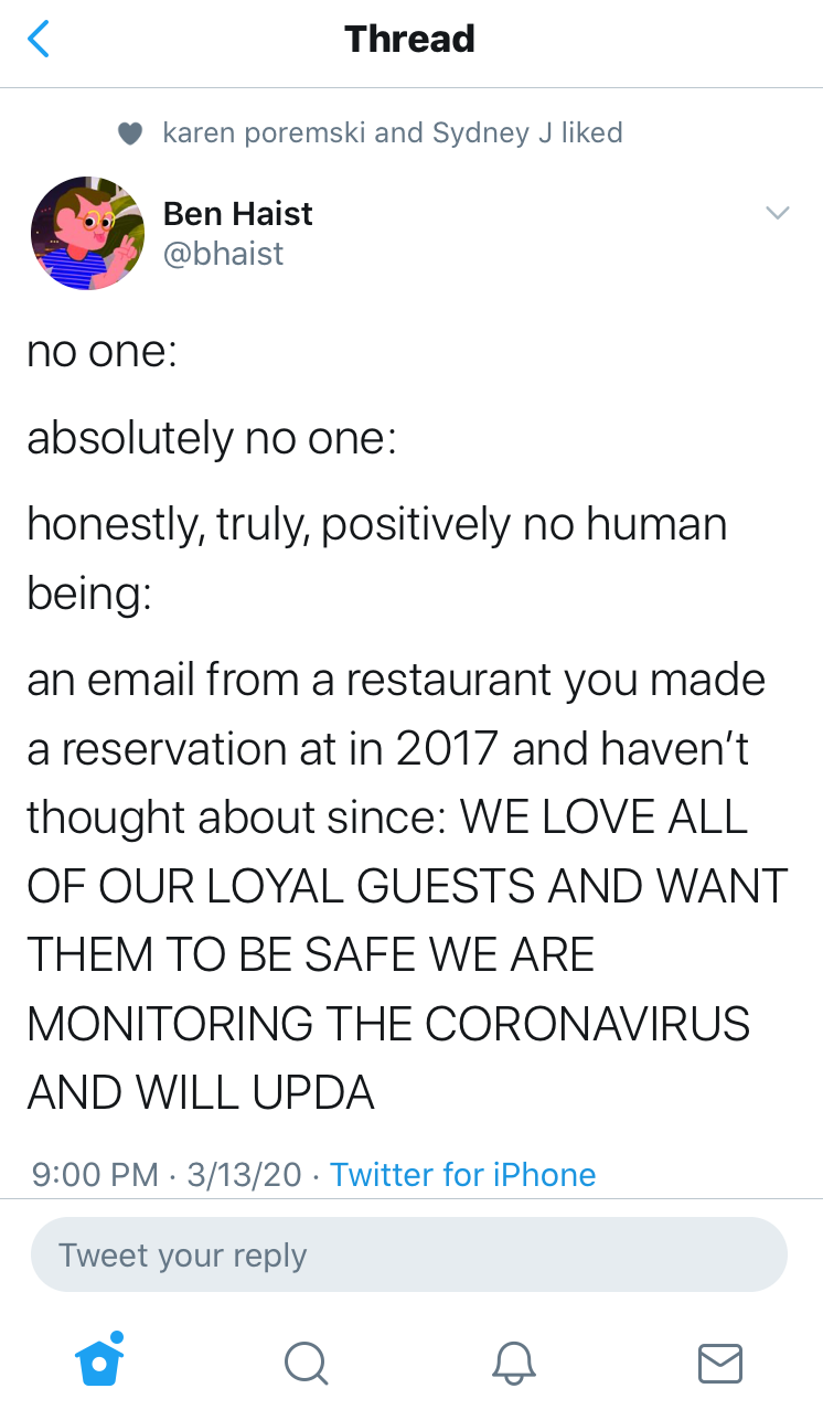 Tweet by Ben Haist: When That One Restaurant You Forgot You Went To Emails You About Coronavirus Precautions