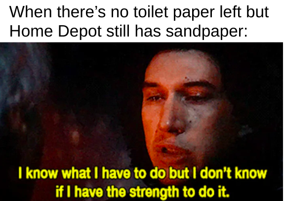 The image shows Ben Solo/Kylo Wren saying an important line from The Force Awakens but it addresses the lack of toilet paper during coronavirus. Due to the fact that people have mass bought out toilet papers from stores, the joke is that Kylo Wren's movie quote conveys the feeling of panic when you have to use the restroom with sandpaper instead of toilet paper.