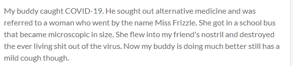 My buddy caught COVID-19. He sought out alternative medicine and was referred to a woman who went by the name Miss Frizzle. She got in a school bus that became microscopic in size. She flew into my friend's nostril and destroyed the ever living shit out of the virus. Now my buddy is doing much better still has a mild cough though.