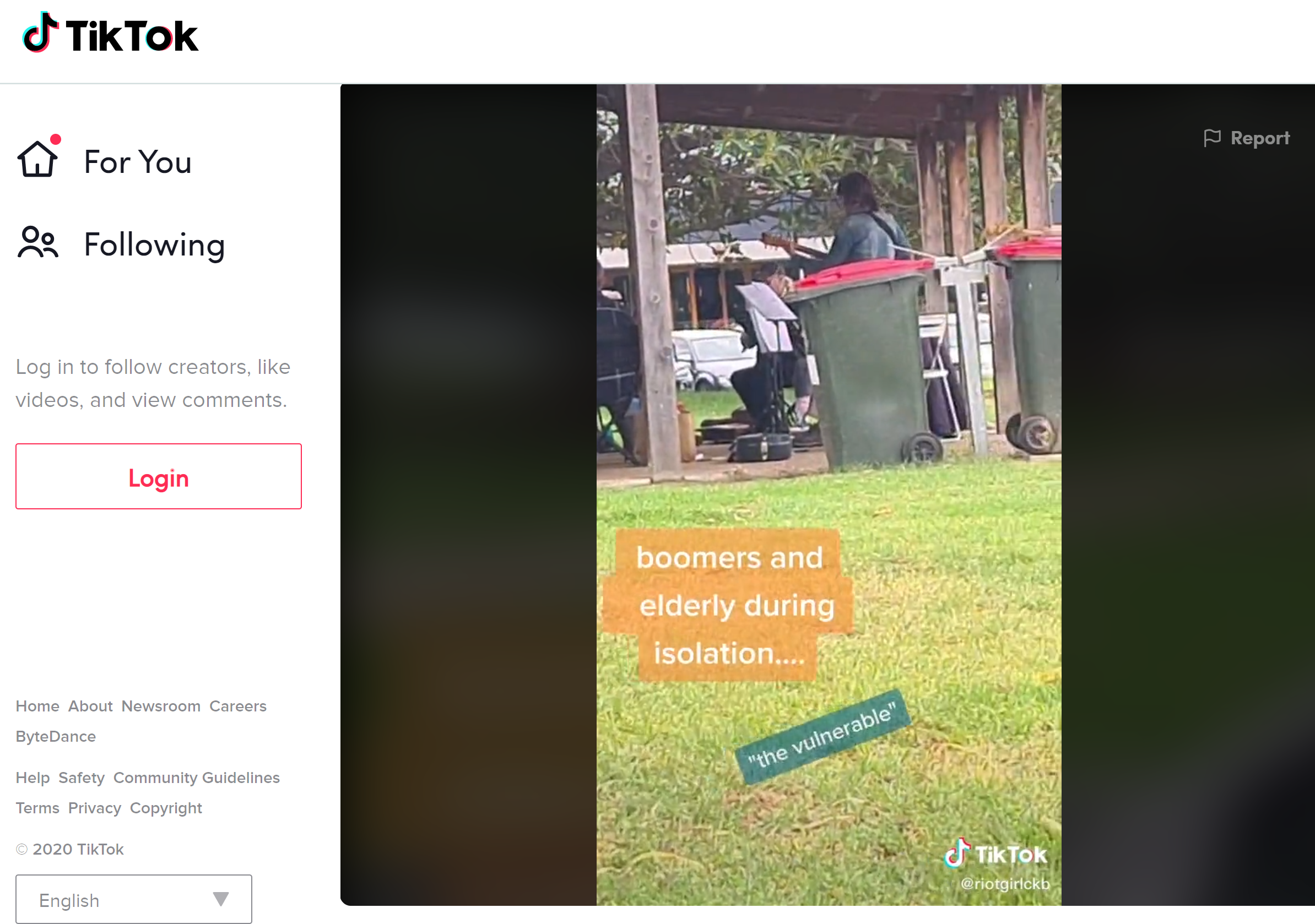 A TikTok showing the creator's perspective that young people are staying inside while older generations are still socializing. #HIST5241