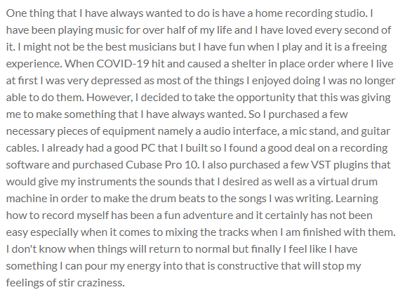 One thing that I have always wanted to do is have a home recording studio. I have been playing music for over half of my life and I have loved every second of it. I might not be the best musicians but I have fun when I play and it is a freeing experience. When COVID-19 hit and caused a shelter in place order where I live at first I was very depressed as most of the things I enjoyed doing I was no longer able to do them. However, I decided to take the opportunity that this was giving me to make something that I have always wanted. So I purchased a few necessary pieces of equipment namely a audio interface, a mic stand, and guitar cables. I already had a good PC that I built so I found a good deal on a recording software and purchased Cubase Pro 10. I also purchased a few VST plugins that would give my instruments the sounds that I desired as well as a virtual drum machine in order to make the drum beats to the songs I was writing. Learning how to record myself has been a fun adventure and it certainly has not been easy especially when it comes to mixing the tracks when I am finished with them. I don't know when things will return to normal but finally I feel like I have something I can pour my energy into that is constructive that will stop my feelings of stir craziness.