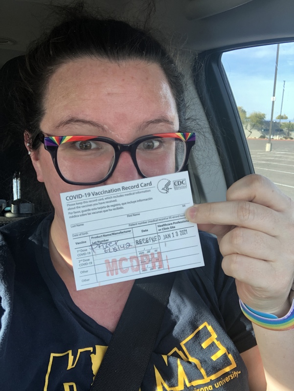 But actually… I have. Because yesterday I was vaccinated with the first dose of the COVD-19 vaccine. My library team and I stalked the website all weekend, waiting for when 1B groups could sign up. I found an open time on Wednesday, January 13, 10 months after March 13, 2020, the day we now say the world fell apart. On top of working, I am a Ph.D. student in history at ASU. So after the first class meeting of my Wednesday class, I drove from Ahwatukee to Chandler-Gilbert Community College and participated in my own parking lot drive-through pandemic procedure. Almost like I was ordering a hamburger in a drive-through. Or maybe I am the hamburger in this analogy? We filed in lines, then split into multiple lanes, guided by a combination of medical staff and National Guard.