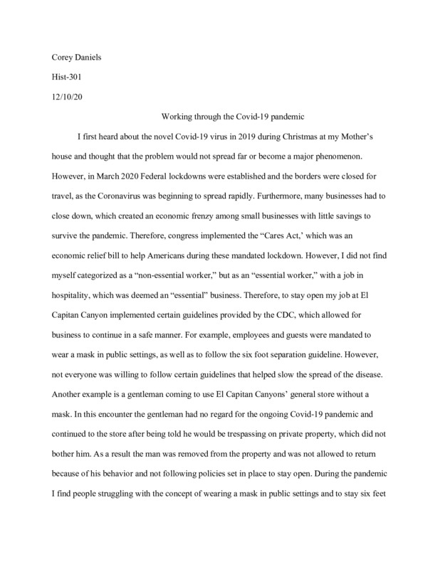 February 2020. Football season is over. The Kanas City Chiefs just won the super bowl. People are still gathering for parties and get-togethers. I turn on the news - The first thing I saw on the screen was "Corona Virus". I had no idea what that meant. I disregarded it as something irrelevant to the world, but I was dead wrong. I went to school the next day (I'm in 7th grade at the time), and I keep hearing students whispering, "corona virus". At this point I knew something wasn't right. About a month later, I'm sitting in the car, in the driveway with my dad. At this point, I know that the corona virus came from China. I know that it's death rate is very very low, yet people are very very worried. I also know that for me, things are completely normal. I did not know however, that things were about to change. On the radio, I heard the voice of the LA county mayor, "I am issuing a mandatory stay-at-home order. Do not leave your house until further notice." I will never forget the events that took place in year 2020.