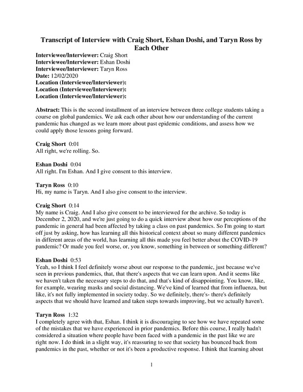 This is the second installment of an interview between three college students taking a course on global pandemics. We ask each other about how our understanding of the current pandemic has changed as we learn more about past epidemic conditions, and assess how we could apply those lessons going forward.