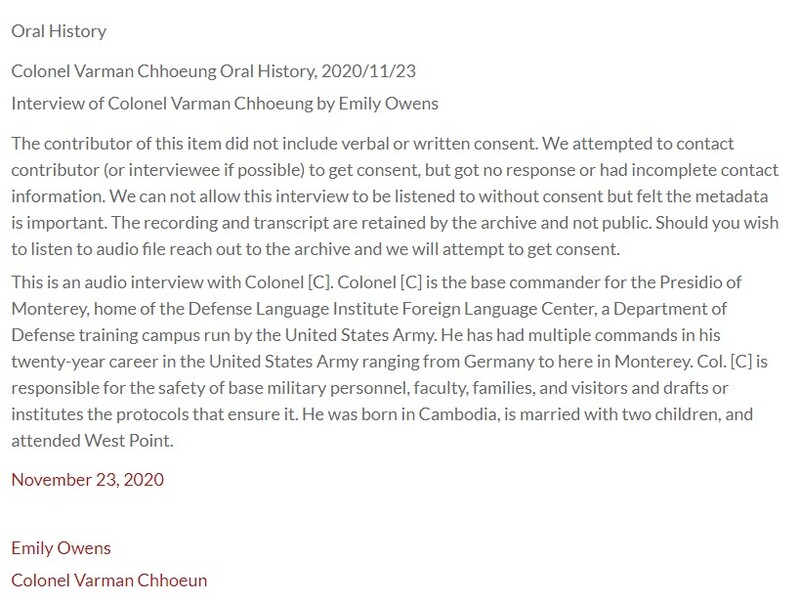 The contributor of this item did not include verbal or written consent. We attempted to contact contributor (or interviewee if possible) to get consent, but got no response or had incomplete contact information. We can not allow this interview to be listened to without consent but felt the metadata is important. The recording and transcript are retained by the archive and not public. Should you wish to listen to audio file reach out to the archive and we will attempt to get consent.